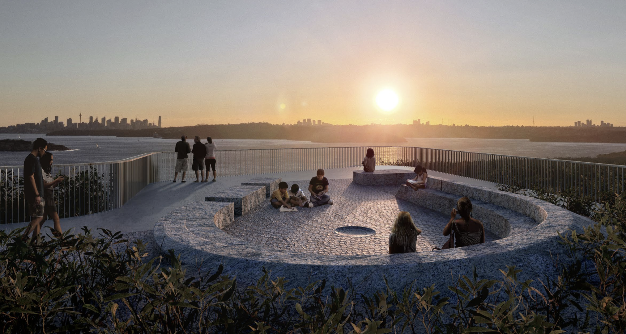 To connect with Country, the name of Burragula has been suggested for the southern lookout. The word acknowledges the long-nosed bandicoot and its association with burragula (sunset), the time of the day when it is most often observed. The view from this lookout is the vista of Sydney Harbour and the distant CBD. Artists’ impressions below